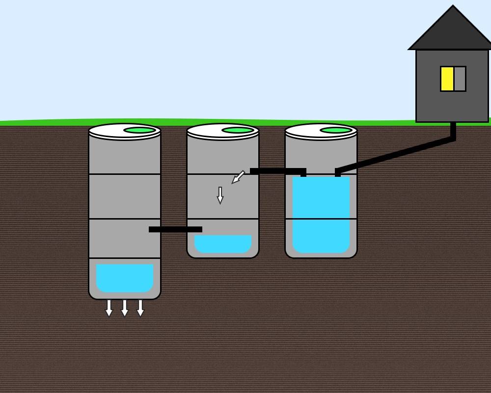 Конструктивно септик может представлять собой даже один протяженный резервуар, однако практичнее разделять зоны по отдельным резервуарам. Потому выкладываются из бетонных колец две-три шахты, соединенных между собой трубами. Первый колодец используется для сбора стоков. В нем проходит первая стадия разделения, вторая фаза анаэробного разложения и частично третья. Во втором резервуаре накапливается уже отстоянная вода частично очищенная и обеззараженная, после чего поступает в грунт через фильтрующий слой и дренажную систему.