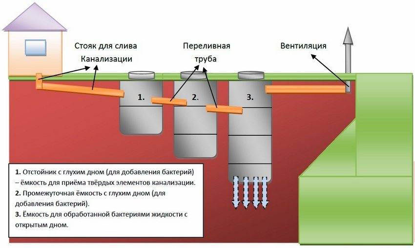 После того, как первая камера наполнится отстоявшимися стоками, жидкость начнет перетекать в следующую камеру. Если она конечная, то без твердого дна. А если последняя емкость по счету третья, то во второй тоже делают бетонное дно, где будет оседать плотная субстанция, а жидкая перетекать в последнюю камеру с открытым дном, расположенным на подушке из щебня и песка. Там отделившаяся жидкость постепенно уходить в грунт.
