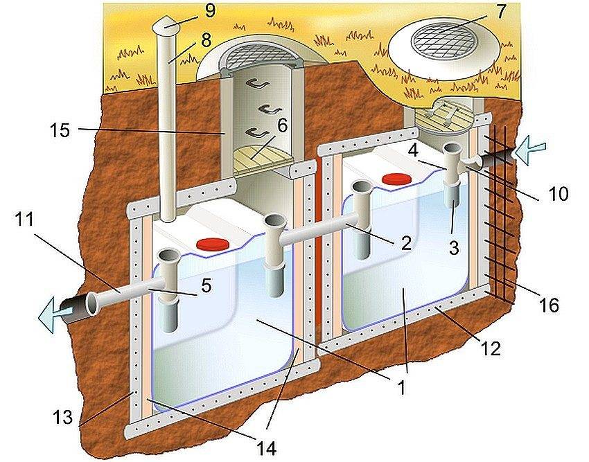 Устройство септика из еврокубов: 1 — колбы еврокубов; 2 — соединительная переливная труба; 3 — удлиняющий патрубок; 4 — впускной тройник; 5 — выпускной тройник; 6 — утепленная деревянная крышка; 7 — крышка люка; 8 — вентиляционная труба; 9 — флюгарка; 10 — подводящий трубопровод (100 мм); 11 — отводящий трубопровод (100 мм); 12 — бетонное основание; 13 — бетонная заливка; 14 — слой теплоизоляции; 15 — бетонное колодезное кольцо; 16 — арматурная сетка