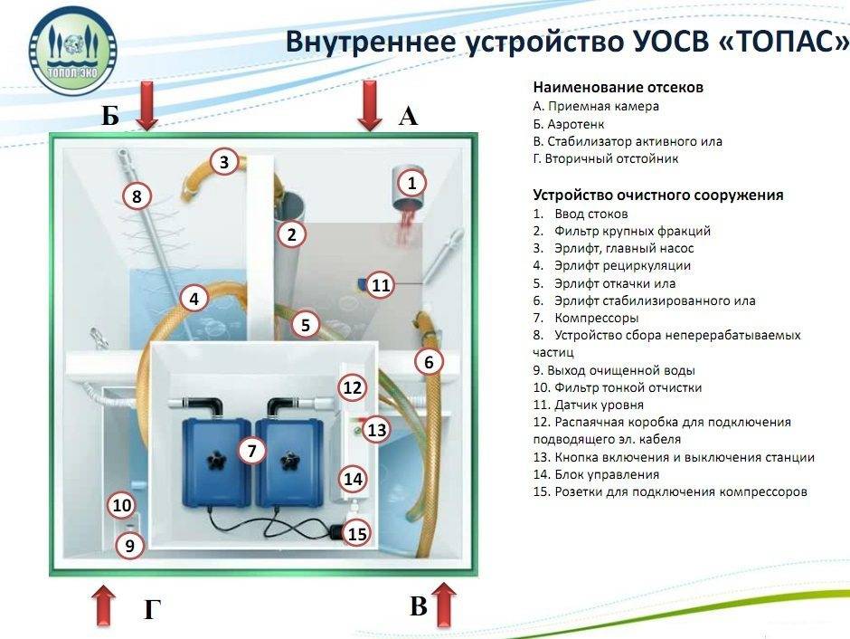 Очистная станция «Топас» разделена на 4 отделения. В каждом из них проходит поэтапная очистка сточных вод. Производитель септика утверждают, что после всех стадий очистки стоки будут очищены на 98% . В качественной и тщательной переработке вредных отходов участвуют специально для этого разработанные аэробные бактерии, которые живут и размножаются в присутствии кислорода. Не нужно заботиться о месте расположения станции для поддержания уровня кислорода, ведь для этого в каждом отдельно взятом отсеке присутствует так называемый аэраторы, подающие в него кислород.