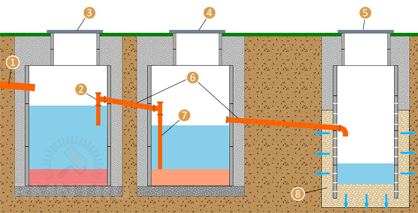 1 — входная труба сточных вод; 2 — тройник; 3 — первичный отстойник; 4 — аэротенк; 5 — дренажный колодец; 6 — ПНД-труба Ø110; 7 — ПНД-труба Ø70; 8 — щебень (гравий)