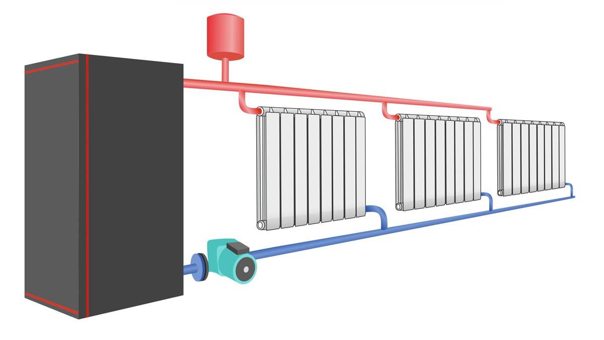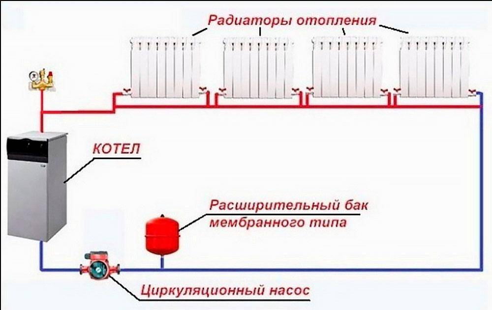 В случае, когда у вас в розетке всегда есть 220 V, «Ленинградку» можно усовершенствовать. Установив циркуляционный насос, мы получим другой тип системы отопления, с принудительным движением жидкости. При этом: