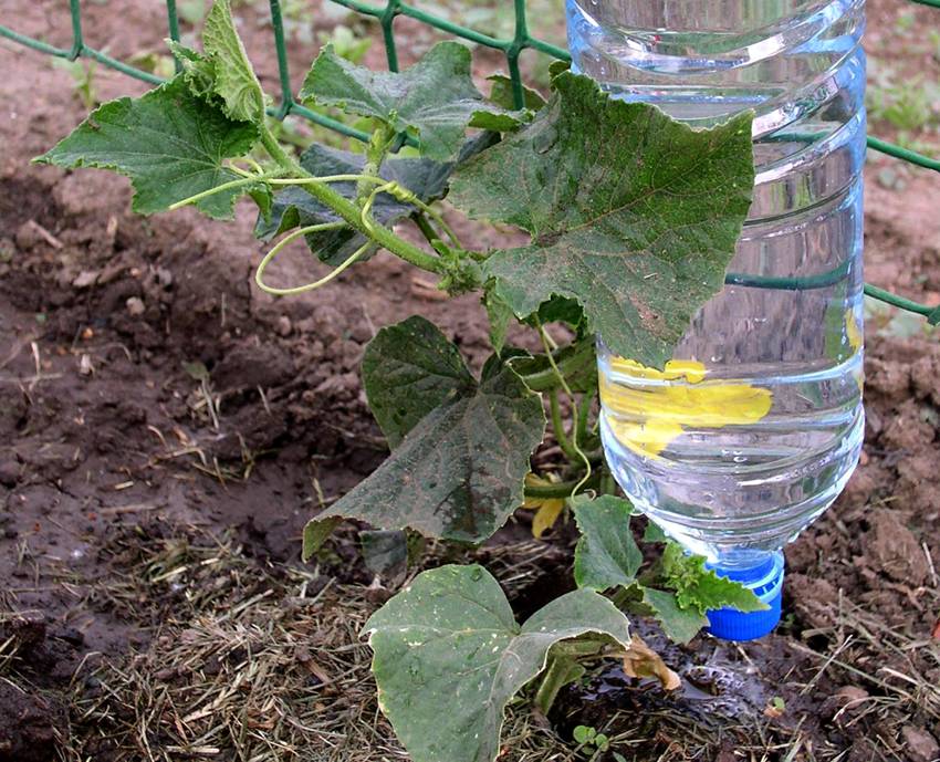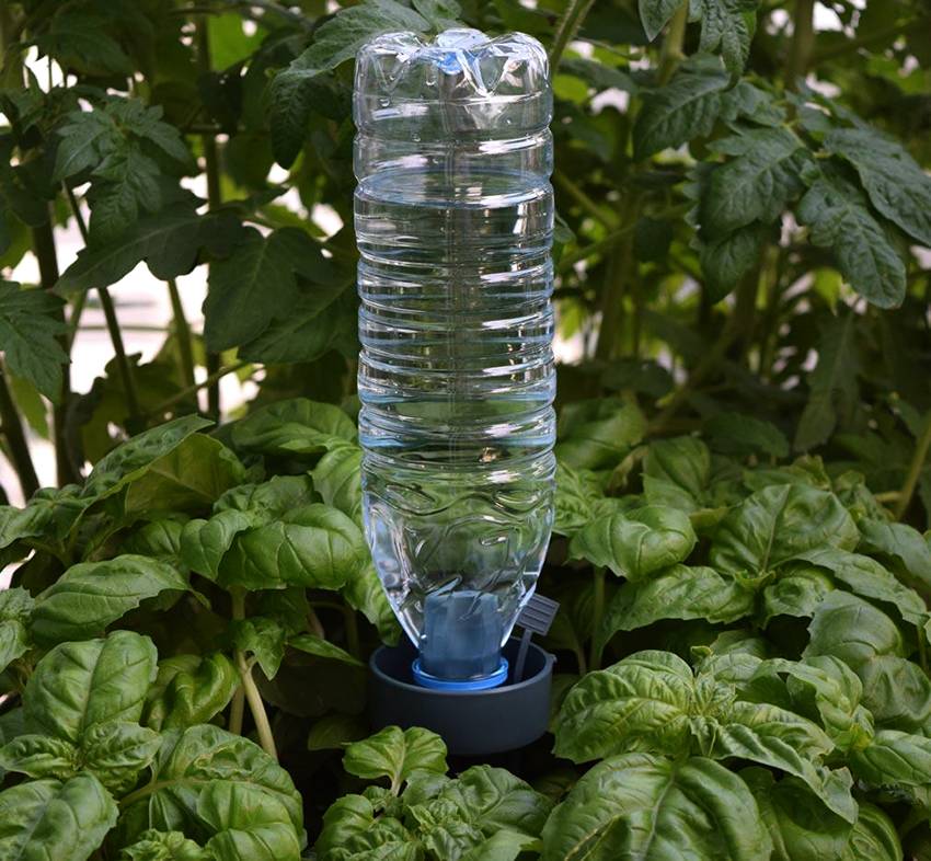 С помощью пластиковой тары можно осуществить прикорневой капельный полив огорода, направив капли воды непосредственно под корень каждого растения. Для данного способа лучше выбрать емкость объемом 1,5 л. В центральной части крышки проделывается отверстие посредством гвоздя. Далее следует срезать дно бутылки под углом 30-40 градусов. Под таким же наклоном относительно земли будет располагаться сама емкость. Тара закрепляется с помощью нескольких палок и скотча как можно ближе к кусту, наклонив горлышко таким образом, чтобы обеспечить попадание воды прямо под корневище.