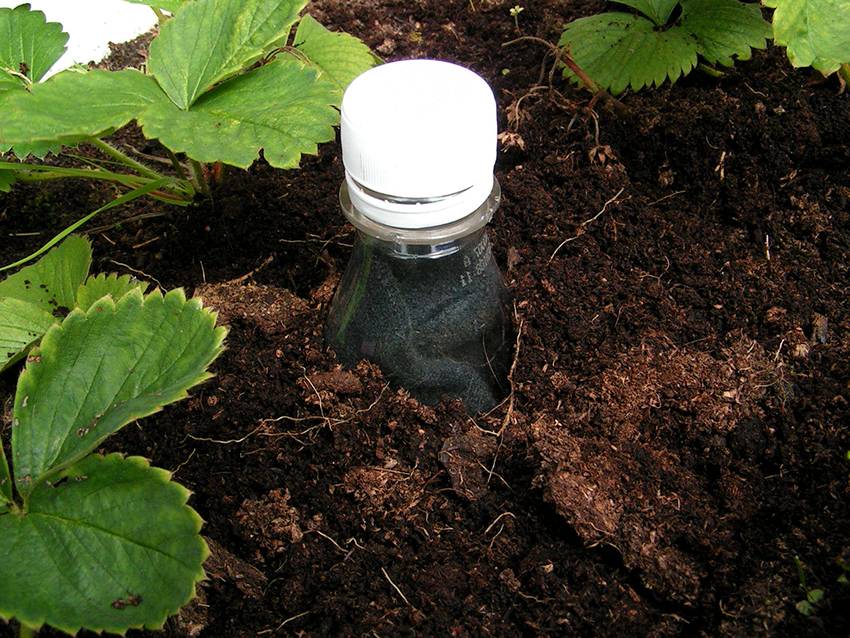 В стержне необходимо выполнить отверстия, количество и размер которых будут зависеть от требуемой интенсивности увлажнения. Он направляется под корень растения, в зависимости от чего бутылка вкапывается в землю на нужную глубину. Тара заполняется водой и закрывается крышкой.