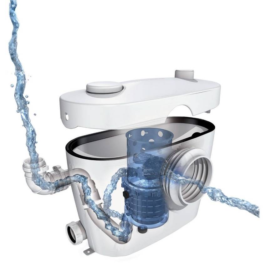 Данный тип насоса для унитаза оснащается механизмом измельчения. Благодаря этому фекалии, туалетная бумага и прочие предметы превращаются в однородную массу, которая эвакуируется в сливную трубу и не засоряет сток. Прибор имеет защиту электродвигателя от перегрева: как только температура мотора достигает критической отметки, устройство отключается. После остывания установка перезапускается автоматически. Канализационный насос с измельчителем имеет компактные габариты и без труда устанавливается за унитазом.