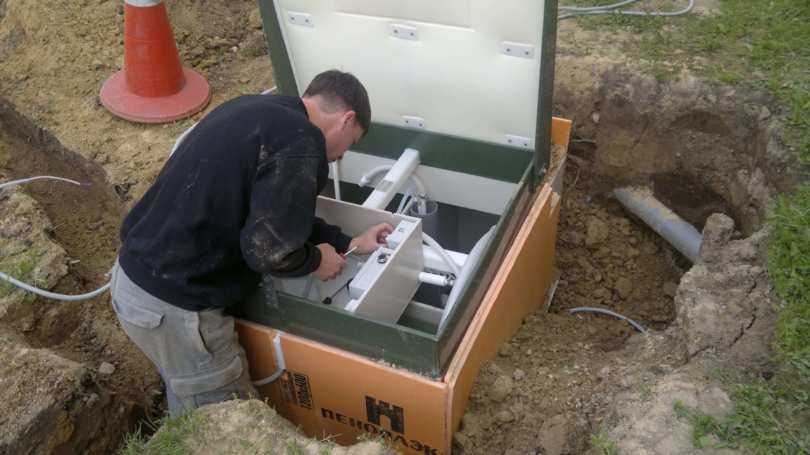 Затем осуществляется установка оборудования и прокладка необходимого электрокабеля, из септика осуществляется герметичное водоотведение, для чего отверстие в корпусе опаивается полипропиленом. Компрессорное оборудование налаживается, а септик, ради поддержания корректного давления, на две трети заливается водой, а также обсыпается песком.
