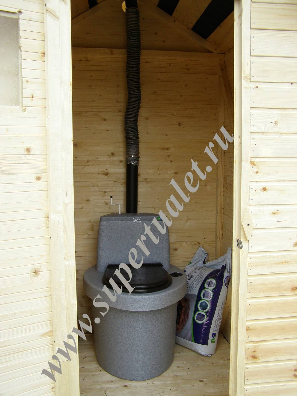 - Конструкции с удаленным компостирующим узлом (есть компостирующий узел, в котором собираются твердые фракции и нечистоты, они устанавливаются в подвале или на улице).