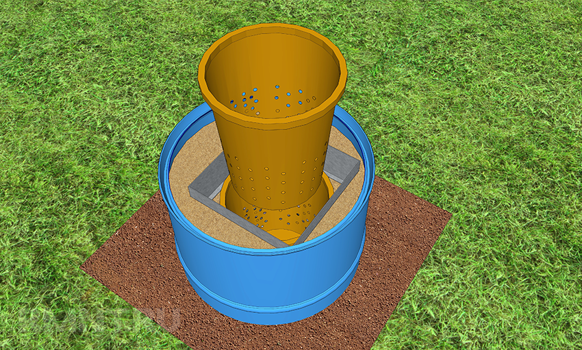 Устанавливаем контейнер с кожухом, верх выравниваем на 2–3 см ниже закрытой крышки бочки. Подвигаем его ближе к переднему краю, примерно в 50–70 мм от стенки. Обсыпаем приёмник со всех сторон песком, чтобы борт кожуха выступал на 30–50 мм, а слой песка от поверхности до первых отверстий в накопителе был не менее 30 см. Слегка уплотняем и проливаем песок небольшим количеством воды. Второй контейнер без усилия можно вставить в первый, а внутрь вложить:
