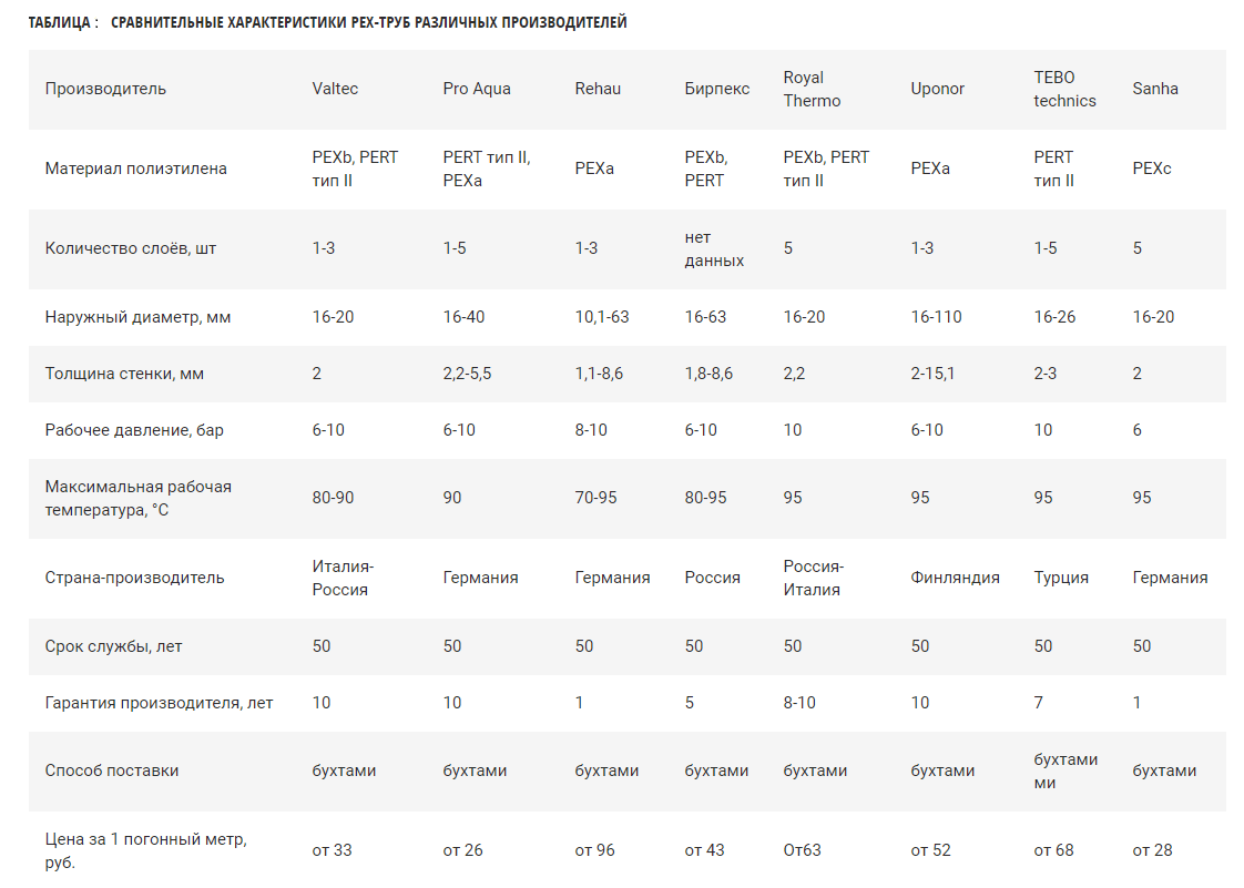 Ниже приведена стоимость труб из PE-X от некоторых известных производителей: