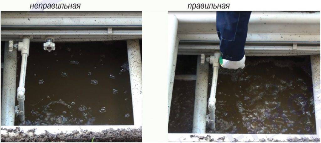 Включить систему аэрации: кран № 1 и № 2 — открыть; шаровые краны № 3 и № 4 — закрыть. Отрегулировать поступление воздуха, используя краны № 1 и № 2, до поступления в аэротенк большего количества воздуха (активное бурление), а в аэробный биореактор малого количества воздуха (отдельные пузырьки не должны сливаться друг с другом).