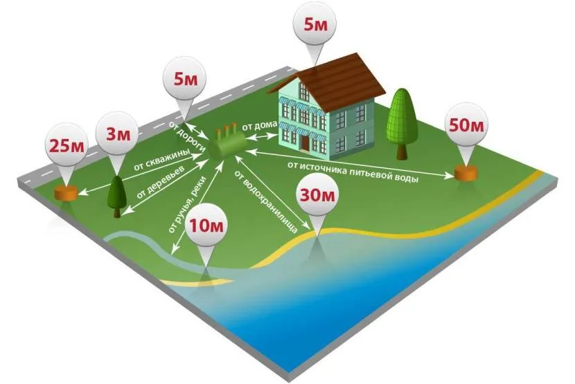 Во время составления проекта необходимо соблюдать техническое расстояние системы от дома, дороги, газопровода, насаждений, источников с питьевой водой и соседей.