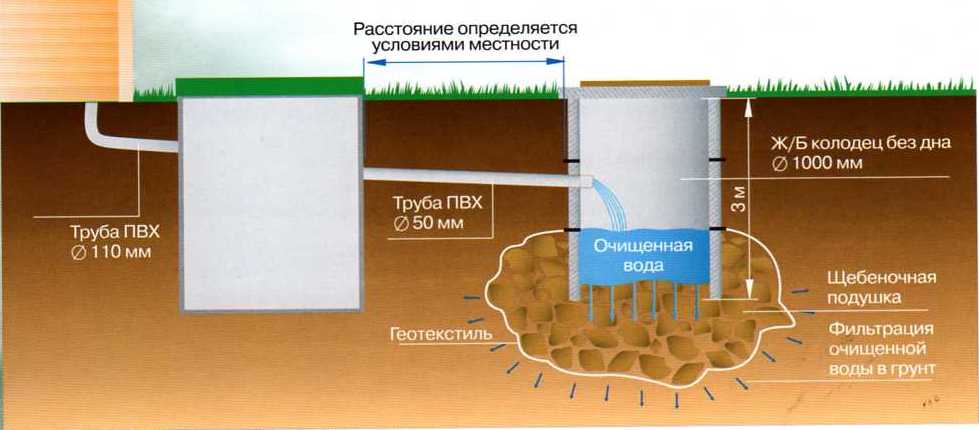 - Между септиком и колодцем с питьевой водой расстояние не менее 50 м.