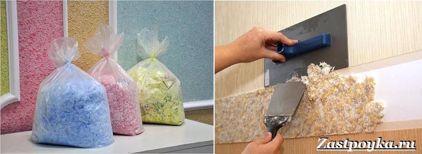 Остается упомянуть сухой клей с красителями, растворимыми водой. Ее добавляют уже в отделываемом помещении. Так обои, собственно, становятся жидкими и готовыми к нанесению на стены. Потолки тоже оформляют.