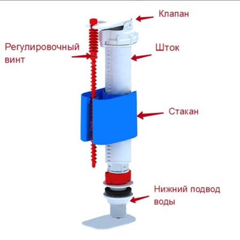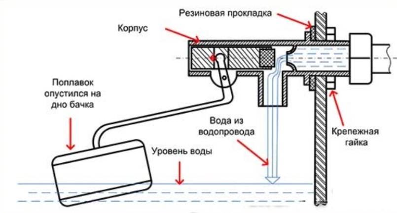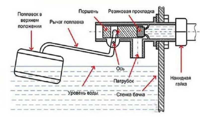 Оптимальный уровень воды в бачке устанавливается скруткой и поплавком. Если поплавок находится в нижнем положении, клапан пропускает воду внутрь, а при поднятии поплавка до определенного уровня процесс набора прекращается.