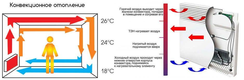 - У радиаторов основная часть передаваемого тепла приходится на излучение. У конвекторов же за распределение тепловой энергии отвечает процесс конвекции – переноса тепловой энергии из более холодной зоны в более теплую.