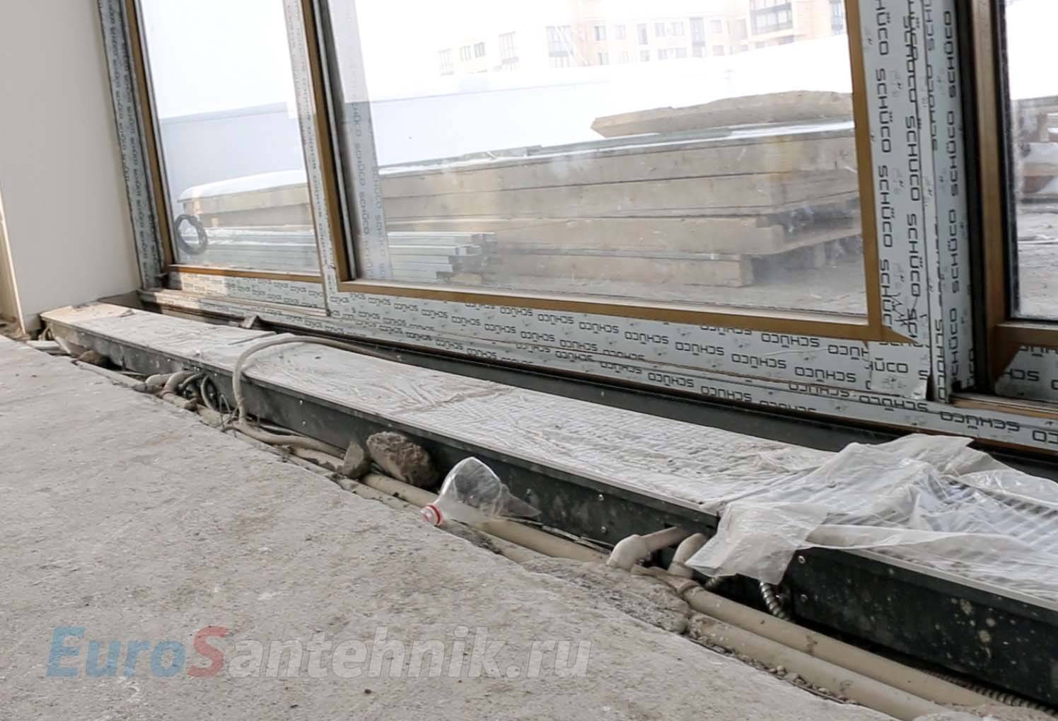 Напольные конвекторы нередко используются в помещениях с панорамными окнами. В этом случае трубы для подводки горячего теплоносителя укладываются в пол. Установка обогревателей сводится к их закреплению и подключению к отопительной системе. Используя самые низкие и компактные модели, можно добиться идеального обзора из окна и качественного обогрева помещений.