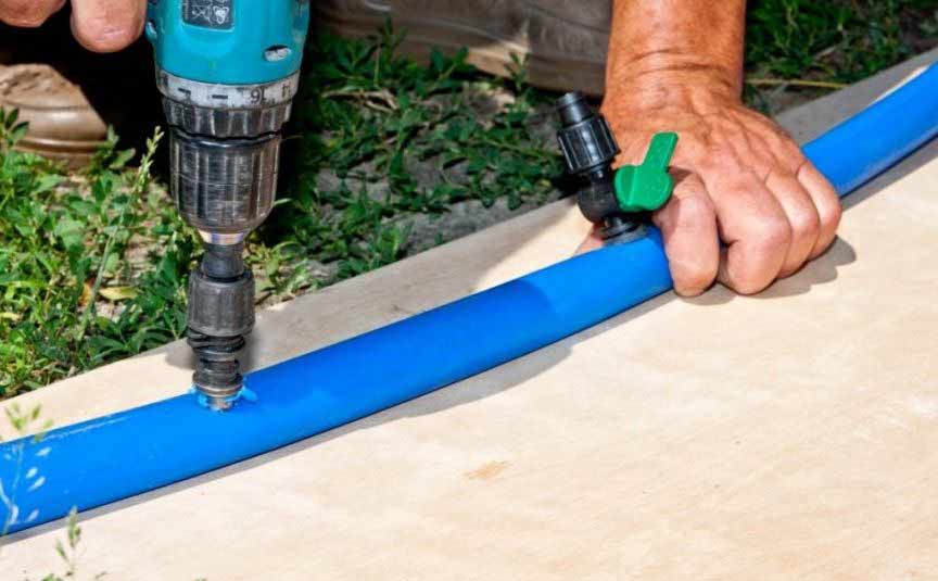 Понадобится электродрель или шуруповерт. Диаметр основной подающей трубы влияет на диаметр сверла: для трубы Ø 32 мм, в которую необходимо врезать вентиль со штуцером (крепится через резиновую или силиконовую прокладку) понадобится сверло Ø 14 мм. Если трубопроводы из полипропилена имеют Ø 25 мм, то используйте сверло Ø 10 мм. Лучше пользоваться сверлами по дереву – выступающий на конце шип не позволит сверлу уйти из центра намеченного отверстия.