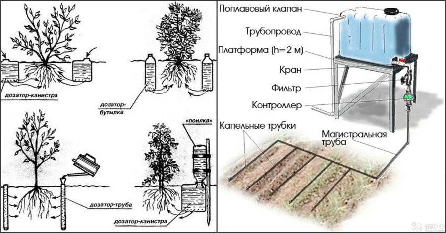 - При поливе удобно одновременно выполнять подкормку растений. Для этого предусматривают специальную ёмкость, соединённую с трубами, в которой в воде растворяют удобрения.