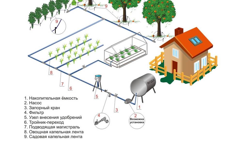 Капельное орошение огорода не меняется, если перенести его в теплицу или в зимний сад, поэтому, один раз собрав такую схему, можно пользоваться ею всю жизнь, и с учетом места использования добавлять или снимать дополнительное оборудование.