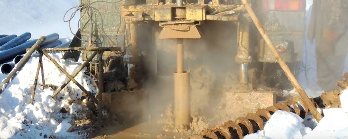 - Мёрзлый грунт. Например, в Подмосковье в холодные зимы земля может промерзать в среднем до 1,4 метра. Понятно, что пробурить верхний замёрзший слой будет сложнее. Впрочем, повторимся, для мощной техники это не препятствие, а ниже уровня промерзания бурение проходит в обычном режиме.